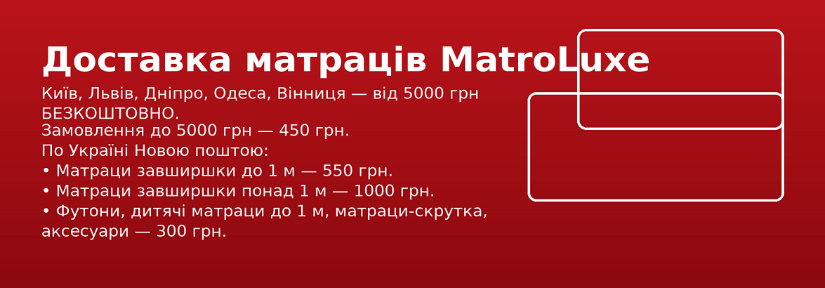 Отдельной категорией представлены матрасы от производителя Matroluxe Это высококачественные комплекты, которые разработаны специально для анатомически правильного положения человека во время сна. Топовые технологии, используемые при изготовлении внутренней структуры матраса, гарантируют его длительный срок эксплуатации без типовых проблем: потеря жесткости и формы, провалы на поверхности и т.д. Выбрать тип изделия, конфигурацию и габариты можно прямо во время заказа.