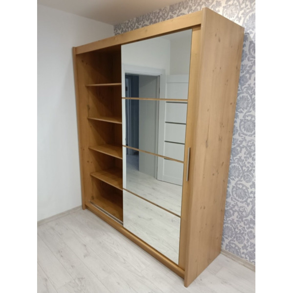 Шкаф имеет размеры: длина 181 см, глубина 61 см и высота 216 см. Он оснащен двумя дверями, которые легко скользят по рельсовой системе. Цветовое решение шкафа - клен онтарио, которое придаст вашему интерьеру нотку уютности и теплоты.